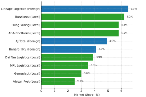 베트남 콜드체인 시장은 상위 10대 기업이 전체 시장의 약 절반을 차지하고 있다. 2023년 기준 시장 점유율 1위는 미국 계열의 Lineage Logistics로 6.5%를 기록했으며, 이어 베트남 물류기업 Transimex가 6.2%로 뒤를 이었다. 수산물 대기업 계열의 Hung Vuong과 현지 기업 ABA Cooltrans가 각각 5.8%를 차지했고, 한국 AJ그룹 계열의 AJ Total은 4.9%, 한국 하나로TNS가 설립한 Hanaro TNS는 4.1%를 기록하며 상위권에 올랐다.