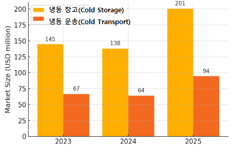 시장 구조를 세부적으로 보면, 냉장창고(Cold Storage)가 약 2024년 1억3800만 달러 규모로 시장의 대부분을 차지하며, 냉동 운송(Cold Transport)은 약 8200만 달러 수준으로 집계된다. 2025년에는 각각 2억100만 달러(냉장창고)와 9400만 달러(냉동 운송)로 확대될 전망이다. 이는 여전히 냉장 보관 수요가 중심이지만, 전자상거래 확산과 신선식품 배송 증가로 운송 부문 또한 빠르게 성장하고 있음을 보여준다.