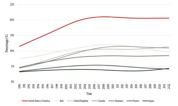 <1990~2022년 G7 국가별 5~19세 아동 비만률>