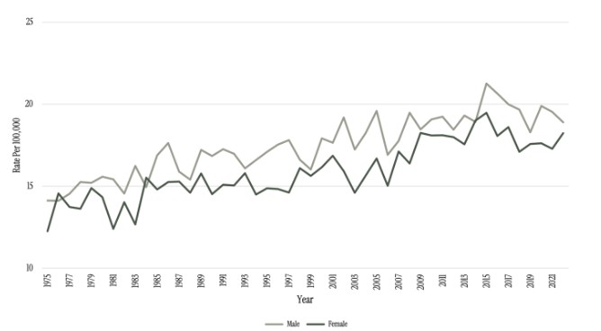 <1975~2022년 0~19세 아동 인구 10만 명당 암 발생률>