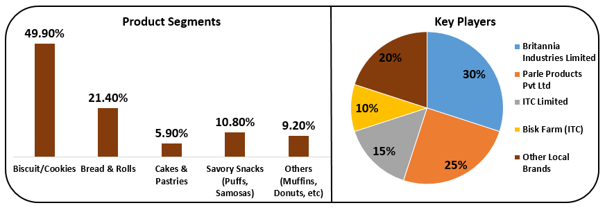 인도의 제빵·제과 부문은 식품가공산업 중 가장 빠르게 성장하는 분야 중 하나로, 성장·혁신·고용의 기회를 제공한다. 비스킷·쿠키가 시장의 약 50%를 차지하고, 빵·롤이 21.4%, 퍼프·사모사 등 현지 스낵류가 10.8%를 구성한다. 주요 기업은 브리타니아(30%), 팔레 제품(25%), ITC(15%)이며, 지역 브랜드들도 20%를 차지한다.