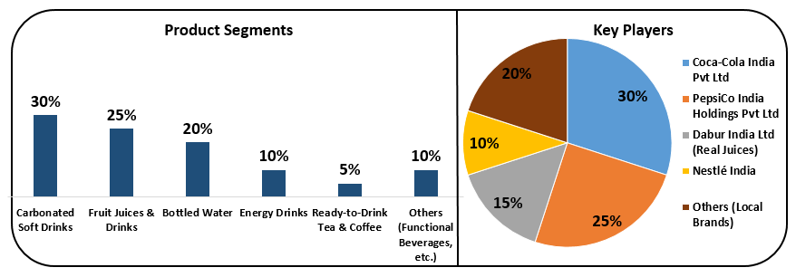 소비 비중은 탄산음료(30%), 과일주스·음료(25%), 생수(20%), 에너지드링크(10%), RTD 차·커피 및 기능성 음료 순이며, 주요 기업으로는 코카콜라(30%), 펩시코(25%), 다부르(15%), 네슬레(10%) 등이 있으며, 현지 브랜드가 20%를 차지한다.