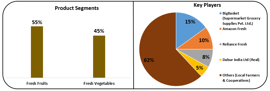 인도는 세계 최대 원예 생산국 중 하나로, 2023~24년 총 생산량은 3억 5319만 톤에 달하며, 이 중 과일이 55%, 채소가 45%를 차지한다. 시장은 여전히 여타 분야에 비해 비조직화된 상태이며, 지역 농민·협동조합이 62%를 차지한다. 하지만 Big Basket(15%), Amazon Fresh(10%), Reliance Fresh(8%), Dabur India(5%) 등 조직화된 유통업체들의 점유율이 빠르게 확대되고 있다.