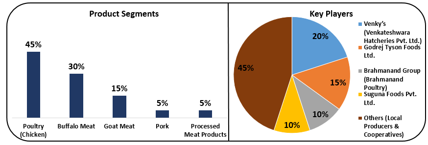 인도는 세계 최대 가축 보유국으로, 2023~24년 연간 고기 생산량은 1025만 톤, 계란 생산량은 1427억 개에 달한다. 2024년 육류 시장 규모는 약 144억 달러로, 2029년까지 161억 달러에 이를 전망이다. 주요 품목은 가금류(45%), 버팔로 고기(30%), 염소고기(15%)가 있으며, 주요 기업은 Venkateshwara Hatcheries(20%), Godrej Tyson Foods(15%), Brahmanand Poultry(10%), Suguna Foods(10%)가 있다.