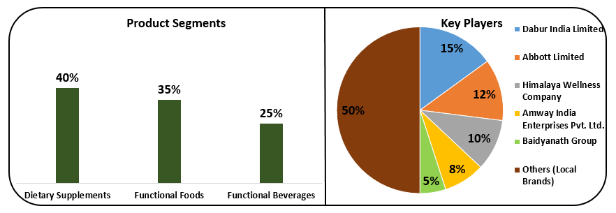 2024년 80억 달러 규모인 인도의 건강보조식품 시장은 커지는 건강 관심, 소비자 기호의 변화, 정부 정책 등에 힘입어 2027년 110억 달러에 이를 전망이다. 다이어트 보충제가 40%, 기능성 식품이 35%, 기능성 음료가 25%를 차지하고 있고, Dabur(15%), Abbott India(12%), Himalaya Wellness(10%), Amway(8%)의 주도 하에 지역 브랜드 또한 50%를 차지하고 있어 치열한 경쟁 구도가 나타난다.