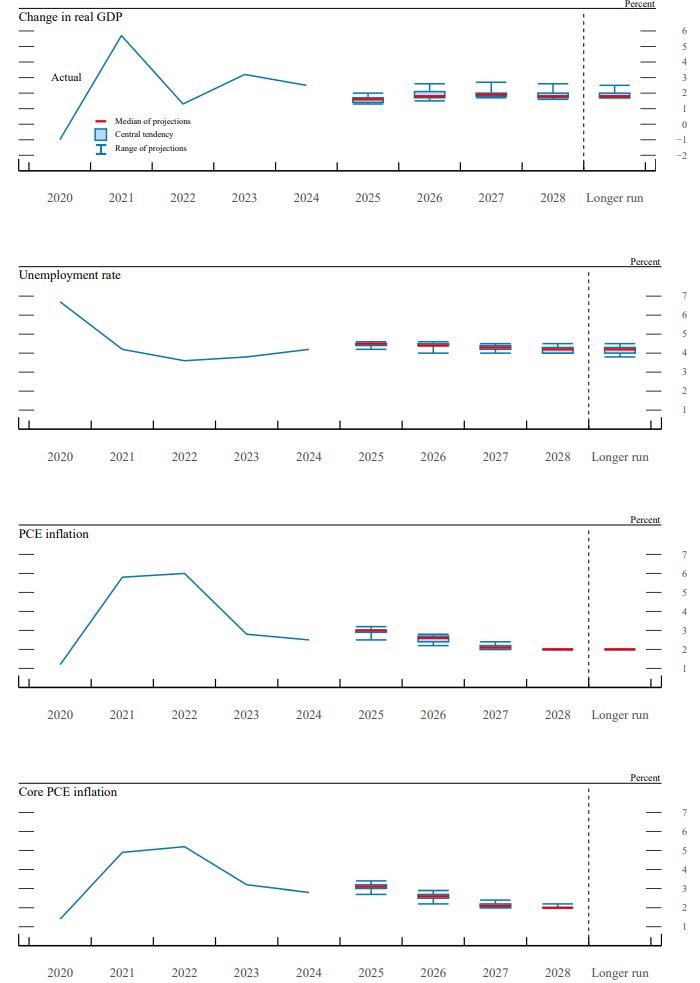 한편, 연준이 금리인하 결정과 함께 발표한 경제전망(Summary of Economic Projections, SEP)에 따르면, 2025년 실질 GDP 성장률 중앙값은 1.6%, 실업률은 4.5%, 개인소비지출(PCE) 물가는 3.0%, 근원 PCE는 3.1%로 제시됐다. 위원 개개인의 전망을 취합한 중심경향치와 범위 역시 과거와 대비해서 성장 전망은 낮아지고 물가 경로는 완만해지는 등, 전반적으로 경기 둔화 위험을 반영해 신중한 모습이었다.