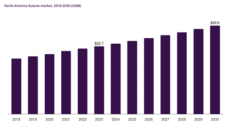 미국은 북미에서 가장 큰 부탄 소비국이자 세계적인 수출국으로, 셰일가스 혁명 이후 시장 지위가 급격히 강화됐다. 글로벌 리서치 기관 Grand View Research 보고서에 따르면, 북미 부탄 시장 규모는 2023년 기준 약 2억6300만 톤에 달하며 2024년부터 2030년까지 연평균 3.8% 성장률(CAGR)을 기록할 것으로 전망된다. 이는 석유화학 원료 수요 증가와 글로벌 에너지 수요 확대 그리고 미국의 적극적인 LPG 수출 전략이 맞물린 결과다. 수출용 LPG 생산을 위해선 정유 및 가스 처리 과정에서 프로판과 함께 부탄이 대량 필요하기 때문에 부탄 수요가 커지게 된다.