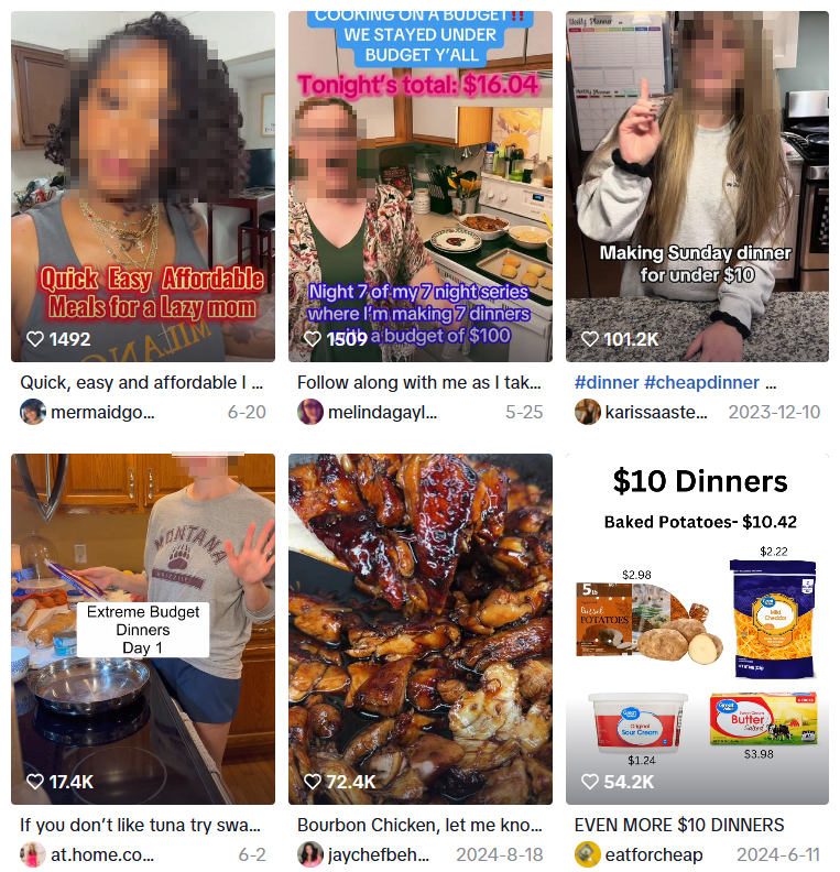 소비자들이 지출을 최소화하기 위해 외식보다 집밥을 선호하면서, 이를 반영한 다양한 콘텐츠가 소셜미디어에서 확산되고 있다. 대표적인 사례가 ‘버짓밀(Budget Meal)’로, 최소한의 비용으로 식료품을 구입하거나 식사를 준비하는 방식을 뜻한다. 최근 틱톡(TikTok)에서는 제한된 예산으로 효율적인 장보기 방법을 공유하거나 소액으로 일주일치 식단을 구성하는 영상이 큰 인기를 얻고 있다. 요리 인플루언서 A씨는 KOTRA 뉴욕 무역관과의 인터뷰에서 “저렴한 한 끼 식사나 최소 예산으로 장보는 방법을 다룬 영상이 특히 높은 조회수를 기록하고 있다”며, “세일 상품 활용이나 대용량 구매 후 소분과 같은 노하우를 소개했을 때 팔로워들의 반응이 가장 긍정적이었다”고 전했다. 그는 또 “일주일 저녁 식사 60달러에 해결하기, 50달러로 4인 가족 장보기, 예산에 맞춘 30일 가족 식단” 등이 인기 영상으로 꼽히고 있다고 덧붙였다.<틱톡 버짓밀 인기 영상 검색>