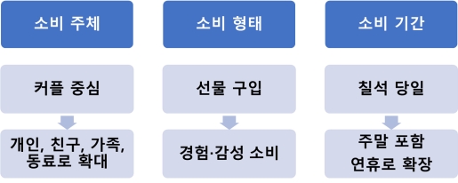 2025년 ‘칠석 경제’는 ▲소비 주체, ▲소비 형태, ▲소비 기간 등 세 가지 측면에서 확장됐으며, 각 항목의 변화는 단순히 외향적인 확장이 아니라, 소비자들의 '감성적 니즈'와 '라이프 스타일'을 반영하는 질적인 전환을 의미한다.