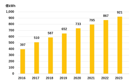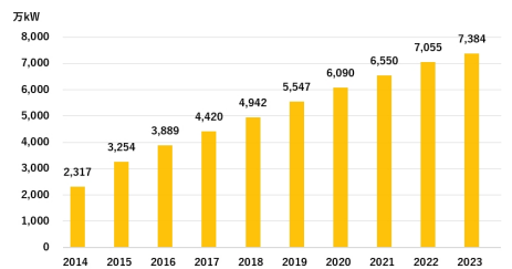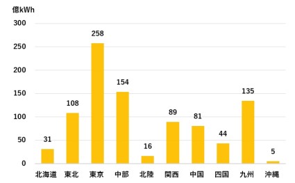 표에서 알 수 있듯, 일본의 태양광 발전 누적 도입량은 2014년 2,317만 kW에서 2023년에는 7,384만 kW로 급격히 성장하였다. 태양광 발전의 발전 전력량은 2023년도에 921억 kWh에 달했는데, 이는 일본 전체 발전 전력량의 9%에 달한다. 송배전망 지역별로 구분하면, 도쿄가 29%, 중부 17%, 규슈 15% 순이다.
