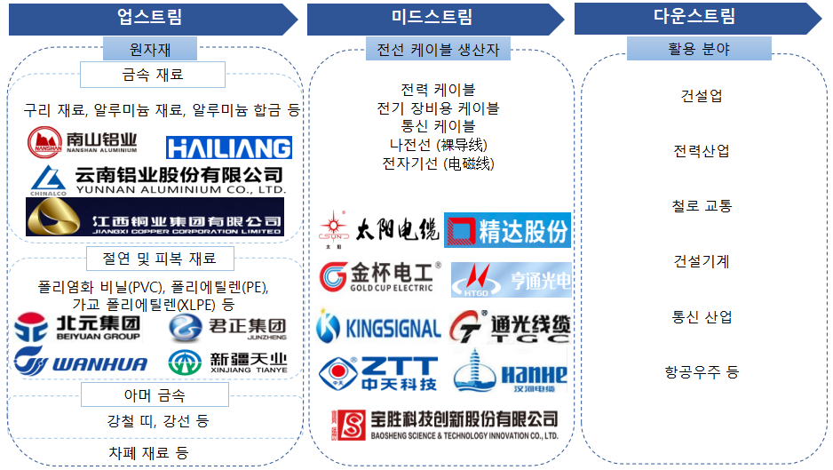 중국 전선 케이블 산업의 업스트림은 원자재(구리 재료, 알루미늄 재료, 알루미늄 합금 등의 금속 재료, 폴리염화 비닐(PVC), 폴리에틸렌(PE), 가교 폴리에틸렌(XLPE) 등의 절연 및 피복 재료, 철 띠, 강선 등의 아머 금속, 차폐 재료 등)를 취급하는 업체들로 구성되며, 미드스트림은 전선 케이블(전력 케이블, 전기 장비용 케이블, 통신 케이블, 나전선(裸导线), 전자기선(电磁线) 포함) 제조 회사로 이뤄져 있다. △건설업, △전력산업, △철도 교통, △건설기계, △통신 산업, △항공우주 등 전선 케이블을 활용하는 다양한 산업군들이 다운스트림을 구성하고 있다.