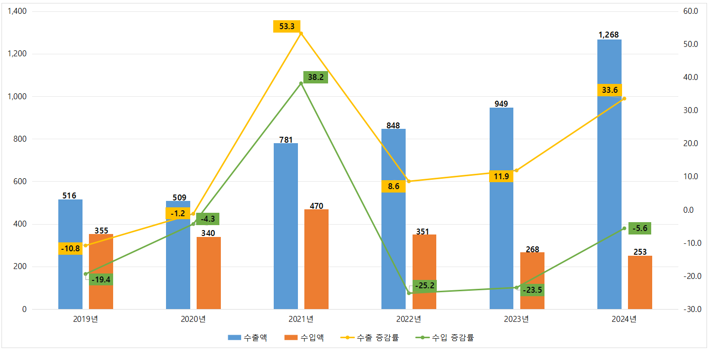 <2019~2024년 중국 전선 케이블 수출입액 및 증감률 추이>