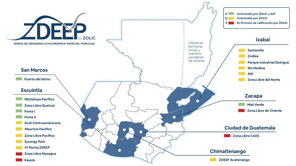 심사 중인 ZDEEP(특별경제개발지대)은 Zona Libre Masagua (에스쿠인틀라), A1 NUMA ZDEEP (에스쿠인틀라), KAWOK (에스쿠인틀라), Cerro Verde (이사발), Solatam (이사발), Zona Libre Gualán (사카파), Zona Libre de Oriente (사카파), Puma I (에스쿠인틀라) 이 있다.