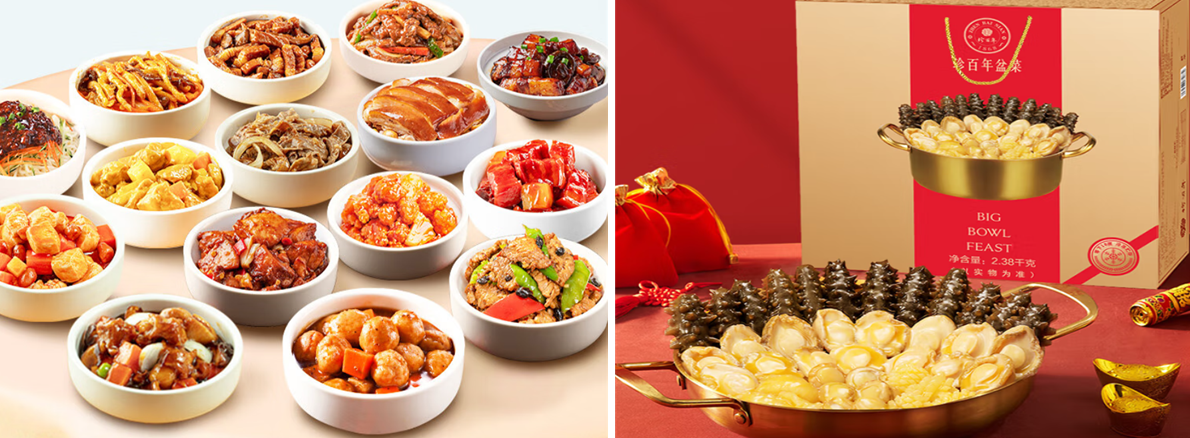 한편, 메이퇀(美团) 같은 배달 앱이 보편화되며 입점하는 중소규모 식당과 업체가 빠른 속도로 늘어났고, 밀키트를 데워 포장해 배송하는 ‘밀키트 배달 전문점’은 그중에서도 특히나 빠른 배송과 간편한 조리 과정으로 화제를 모으기도 했다. 아이미디어 리서치(艾媒咨询)의 통계에 따르면, 이미 라이브 커머스와 배달 시장에서 성장한 밀키트 산업은 코로나19 이후 더욱 활발해져, 중국 밀키트 시장 규모는 2018년 1000억 위안에서 2022년 4100억 위안으로 확대됐다. 또한 가성비 중심 제품뿐 아니라, 취안쥐더(全聚德)와 같은 유명 중식 체인 브랜드들도 전복 요리, 베이징 덕 등 고급 식재료와 복잡한 요리들을 밀키트 형태로 개발해 전국적으로 판매하고 있다.