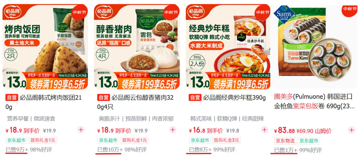 <징동닷컴에서 판매량 1만 개 이상을 기록한 한식 간편 조리식품>