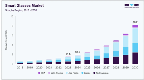 매출 규모 역시 가파르게 증가하고 있다. 글로벌 스마트 글라스 시장은 2024년 약 19.3억 달러 규모에서 2030년에는 약 82.6억 달러까지 성장할 것으로 예상되며, 이는 해당 산업이 본격적인 성장 궤도에 진입하고 있음을 보여준다.