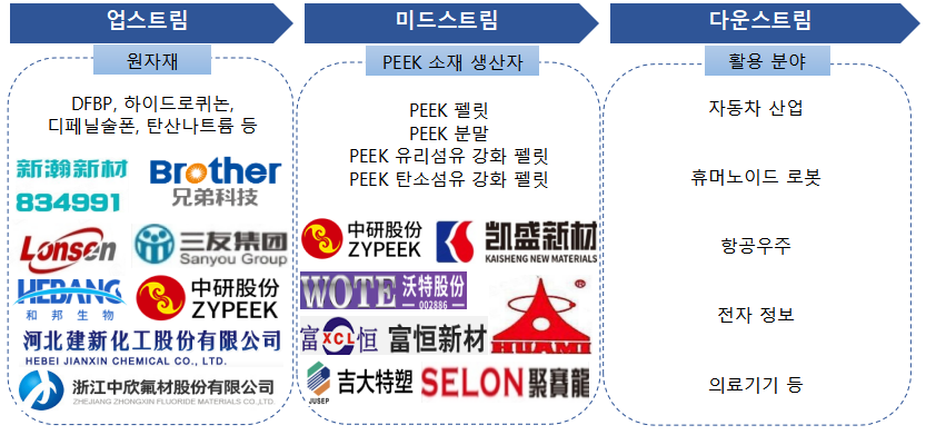 중국 PEEK 소재 산업의 업스트림은 원자재(DFBP, 하이드로퀴논, 디페닐술폰, 탄산나트륨 등)를 취급하는 업체들로 구성되며, 미드스트림은 PEEK 소재(PEEK 펠릿, PEEK 분말, PEEK 유리섬유 강화 펠릿, PEEK 탄소섬유 강화 펠릿을 포함) 제조 회사로 이뤄져 있다. △자동차 산업, △휴머노이드 로봇, △항공우주, △전자 정보, △의료기기 등 PEEK 소재를 활용하는 다양한 산업군들이 다운스트림을 구성하고 있다.