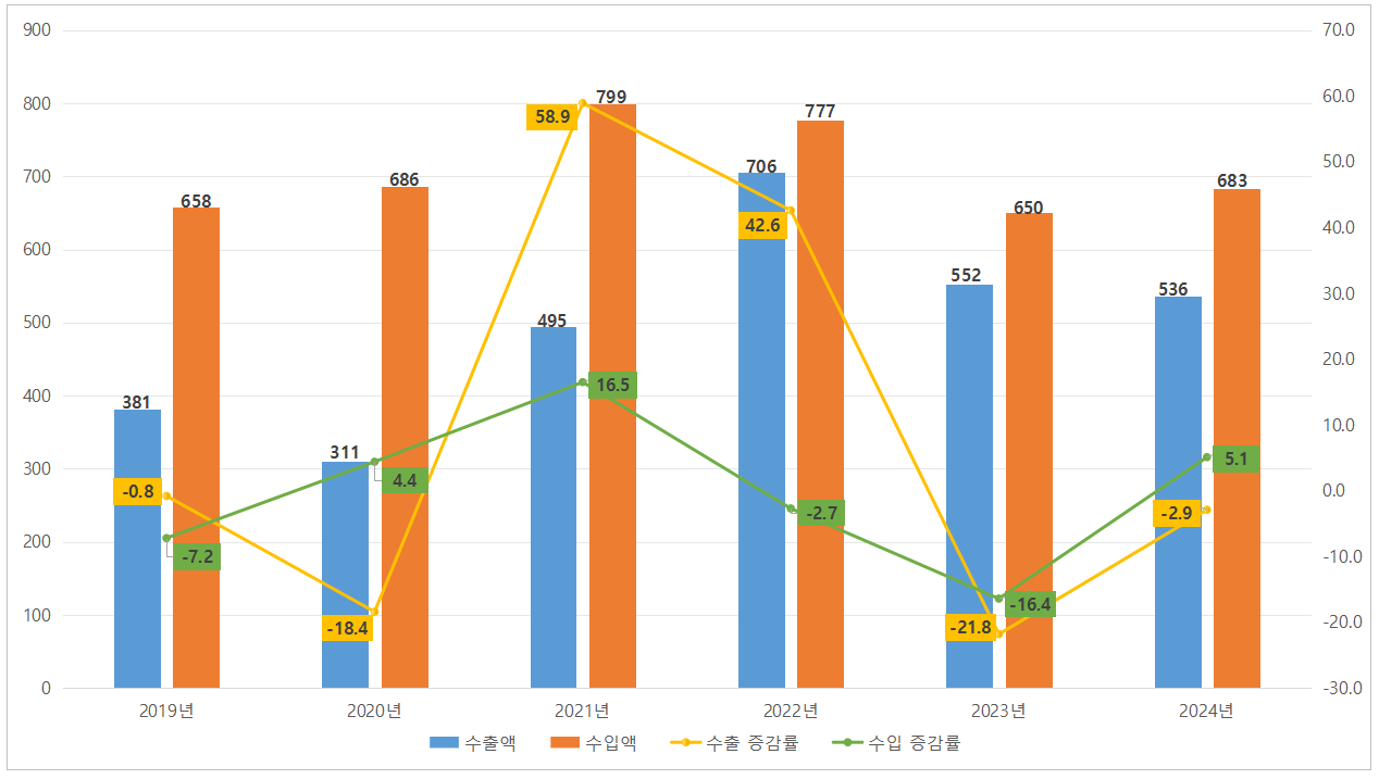 <2019~2024년 중국 PEEK 소재 수출입액 및 증감률 추이>
