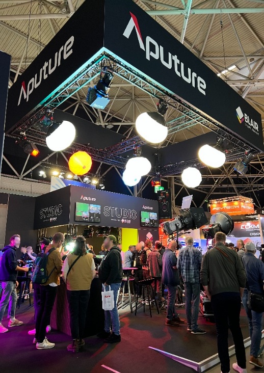 이번 전시회는 방송 송출(OTT, 클라우드, 사이버보안), 제작(카메라·렌즈·조명), 후반 제작(가상 스튜디오·그래픽), 미래 기술(AI, 블록체인, 광고 기술), 오디오 및 몰입형 기술(VR/AR, 메타버스), 송출(위성·분배) 등 방송 전 과정의 최신 기술을 한 자리에서 조망할 수 있도록 구성됐다. 특히 올해는 ‘Future Tech’ 존을 새롭게 선보이며 AI와 몰입형 미디어, 5G, 지속가능성에 초점을 맞췄다.<IBC 2025 Aputure 부스 전경>