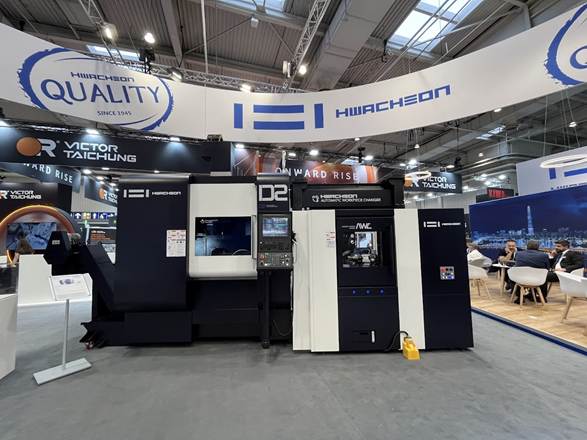 디지털화 측면에서 이번 전시회에 참가한 우리 기업 화천기공의 약진도 주목할 만했다. 동사는 5축 가공기, 복합 가공 선반, 흑연 가공기 등 다양한 제품군을 갖추고 이미 항공 부품 생산 기업에 기계를 납품하며 세계적인 수준의 정밀 가공 기술력을 인정받고 있다. 이번 전시회에서는 자동 공작물 교환장치(AWC)와 통합된 고정밀 5축 머시닝 센터 'D2-5AX'를 비롯한 다양한 자동화 솔루션을 선보이며 뛰어난 하드웨어 기술력을 과시했다. 무역관이 현장에서 만난 화천기공 담당자는 이에 관해 "자동 공작물 교환장치(AWC)를 통합한 것은 최근 제조업의 핵심 트렌드인 다품종소량생산 환경에 최적화된 솔루션을 제공하기 위함"이라고 설명했다.