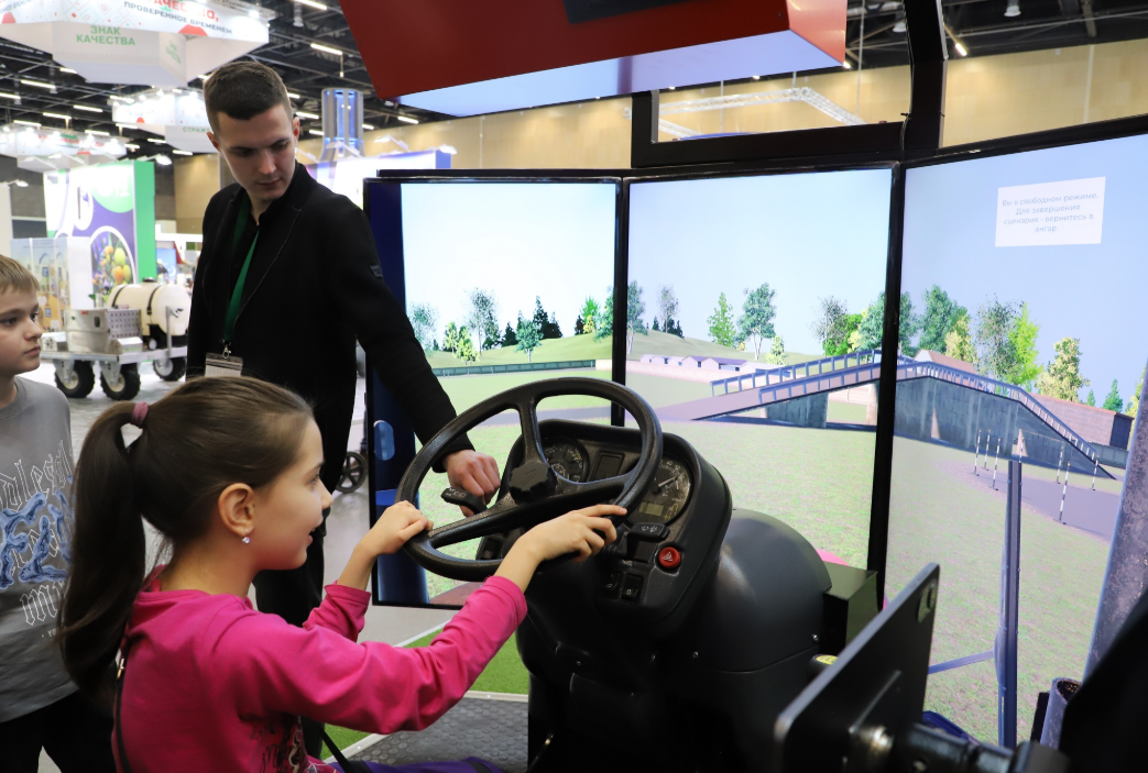MY BELARUS 전시회에서 마인드 게임즈 소트트웨어(Mind GamesSofteware)의 VR 모듈이 탑재된 디지털 트랙터 시뮬레이터 전시