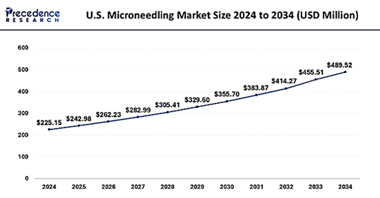 디바이스 분야의 혁신도 두드러진다. 마사지 브러시(massage brush)와 레드라이트 기기(red light device)에 이어 마이크로니들링 디바이스(microneedling device)가 새로운 카테고리로 자리 잡고 있다. 미국 마이크로니들링 시장은 2024년 기준 약 2억2515만 달러로 평가되며, 2025년부터 2034년까지 연평균 8% 성장해 2034년에는 4억8952만 달러에 이를 것으로 전망된다(Precedence Research). 마이크로니들링은 탈모 관리 및 모발 회복을 원하는 소비자 사이에서 빠르게 확산되고 있다. 미세 바늘을 활용해 두피에 자극을 주는 방식으로 콜라겐 생성과 혈류 개선을 유도하고, 모낭의 영양 흡수를 돕는다. 모발 굵기 개선과 재성장 효과가 알려지면서 모발 이식 수술 대신 비수술적 대안을 찾는 소비자 수요가 뚜렷하게 증가하고 있다.