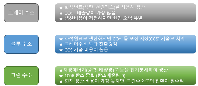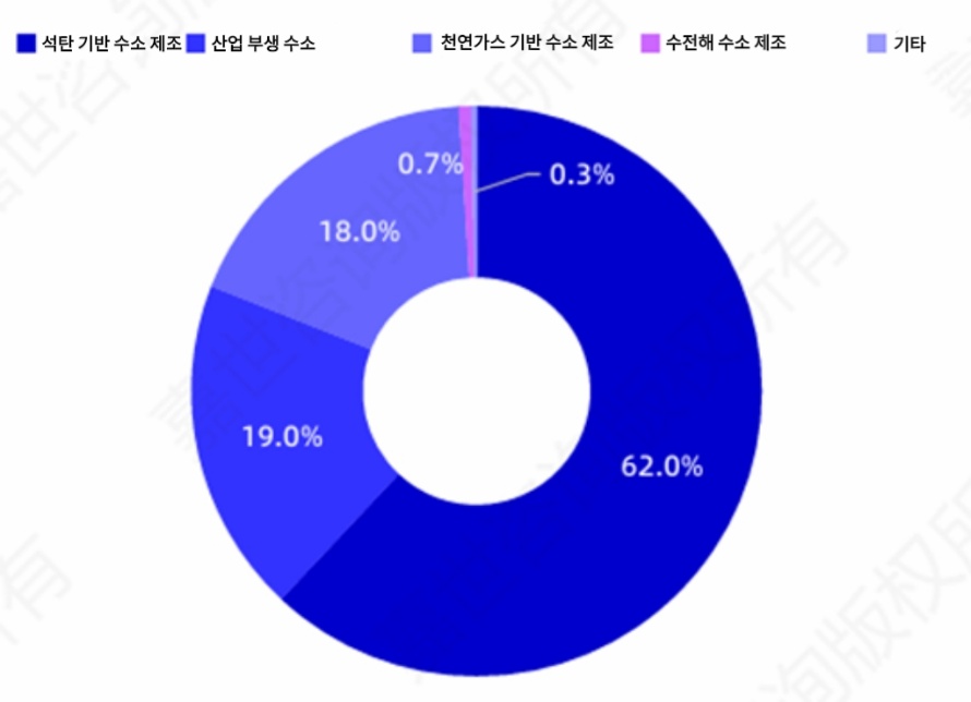 수소에너지는 제조 공정과 탄소 배출 여부에 따라 크게 3가지로 나뉜다. 산업 부산물 또는 화석 연료를 이용해 생산하는 그레이 수소, 화석연료에서 수소를 추출하는 과정에 탄소포집(CCS) 기술을 접목해 탄소 배출을 감축시킨 블루 수소, 그리고 풍력, 태양광 등 재생에너지만을 활용해 물을 전기분해하여 생산하는 그린 수소가 있다. 현재 중국의 수소 산업은 그레이 수소 비중이 압도적으로 높다. 중국 수소에너지 연맹의 2023년 통계에 따르면, 중국의 연간 수소 생산량 3500만 톤 중 석탄 화학 공정을 통한 수소 생산이 62%를 차지했고, 산업 부산물 수소가 19%, 천연가스 수소 생산이 18.1%를 기록했다. 물 전기분해를 활용한 그린수소 생산 비중은 0.7%에 불과하였다.