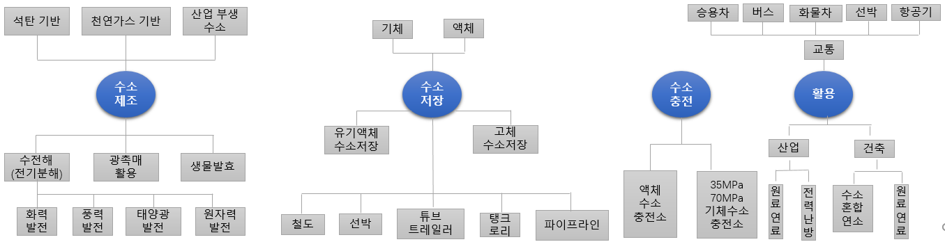 수소 에너지 산업 가치사슬은 수소 생산-저장·운송-충전-활용으로 나뉜다. 최종적으로 수소는 교통분야(수소연료전지)와 산업 에너지(화학/제련/열병합 산업) 등에 활용된다.