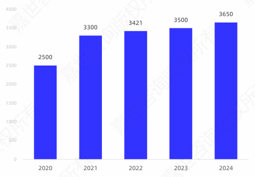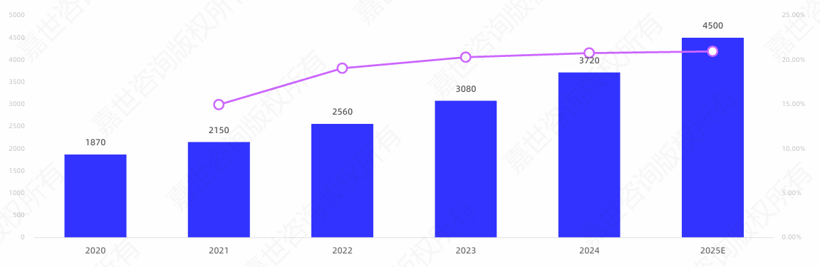 중국의 수소에너지 산업은 매우 빠르게 성장하고 있다. 수소에너지 산업 규모는 2020년 1870억 위안이었지만 연평균 13% 이상의 성장률을 기록하며 2024년 산업 규모는 3720억 위안으로 커졌다. 2022년과 2023년의 성장률은 20.3% 이상을 기록했다. 2025년에도 정책지원과 기술 발전으로 전년 대비 21% 이상 성장하여 전체 시장 규모가 4500억 위안에 달할 것으로 전망된다. 향후 그린 수소 생산, 수소저장·수송 인프라 및 연료전지 적용 분야에서의 높은 수요가 수소 산업의 높은 성장을 견인할 것으로 예상된다.