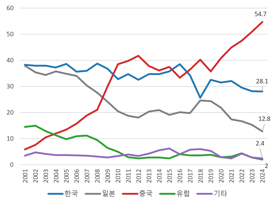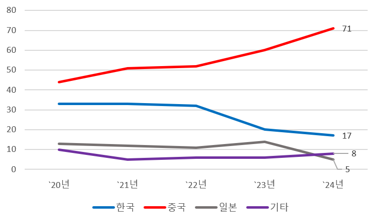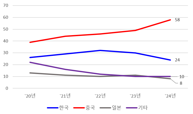 ・발주 기회 축소: 일본 점유율은 2023년 14%에서 2024년 5%로 하락, 발주 기회 축소와 경쟁력 약화 악순환 가능성