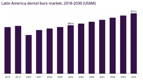라틴아메리카 치과용 버 시장은 꾸준한 성장세를 이어가고 있다. Grand View Research보고서에 따르면, 2024년 기준 이 시장의 규모는 약 5840만 달러로 집계되었으며, 2030년에는 약 7290만 달러에 이를 것으로 전망된다. 이는 2025년부터 2030년까지 연평균 3.8%의 성장률을 기록할 것으로 예상되는 수치로, 지역 전반에서 치과 진료 수요가 점진적으로 확대되고 있음을 보여준다. 세부적으로는 다이아몬드 버가 가장 큰 매출을 기록했으며, 심미적·보존적 치료 수요가 늘어나면서 고정밀 절삭 및 마무리 작업에 대한 수요가 이를 뒷받침하고 있다.