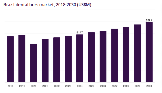 브라질 시장도 이 흐름과 궤를 같이한다. 같은 보고서에 따르면, 브라질 치과용 버 시장은 2024년 약 1970만 달러 규모를 기록했으며, 2030년에는 약 2470만 달러에 이를 것으로 전망된다. 이 기간 동안의 연평균 성장률은 3.7%로, 지역 평균과 유사하다. 브라질 시장에서도 다이아몬드 버가 가장 큰 매출을 차지하지만, 임플란트·보철 시술 증가와 내구성에 대한 선호 확대로 카바이드 버가 빠른 성장세를 보일 것으로 전망된다.