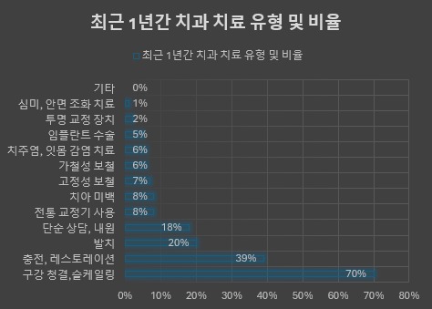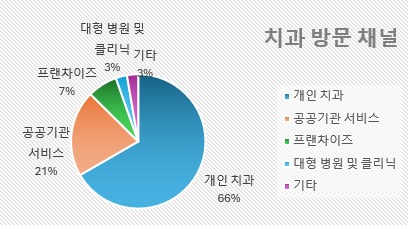 치과 방문 채널별로는 개인 치과가 74%로 가장 많고, 공공 서비스는 23%, 프랜차이즈 네트워크는 8%로 나타났다.