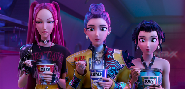 <컵라면을 먹고 있는 케이팝 데몬 헌터스 3인의 주인공>