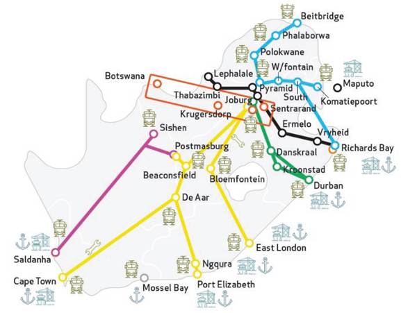 <남아공 국영물류공사 Transnet이 운영하는 철도 회랑 및 항만 지도>