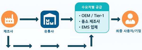 유통사는 재고 관리, 기술 지원, 물류 최적화, 수요 예측 등을 통해 복잡한 반도체 공급망의 변동성을 완화하며, 공급 부족이나 가격 변동과 같은 리스크에 대한 완충 장치 역할을 한다. 다만 일부 고성능 메모리 제품군(예: 고대역폭 메모리, 특수 DRAM 등)은 유통 경로가 제한적이다. 이러한 제품들은 대형 OEM과 제조사 간 직거래나 특정 유통사와의 별도 계약을 통해 공급되기도 한다.