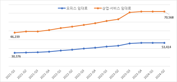 위 그래프에 따르면, 2021~2024년 2분기 기준 오피스 평균 임대료는 ㎡당 30,376MNT → 53,414MNT로 약 75.8% 상승, 상업·서비스용 임대료는 46,239MNT → 70,568MNT로 약 52.6% 상승했다.
