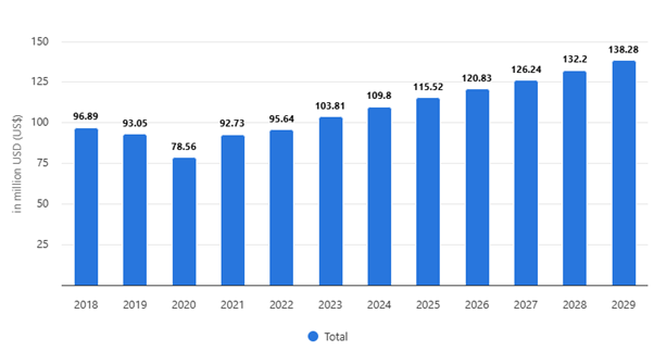 호주 콘택트렌즈 시장은 꾸준한 성장세를 보이고 있으며, 2025년에는 약 1억 1,552만 미국달러 수준에 이를 것으로 전망된다. 이후 2025년부터 2029년 까지 연평균 4.6%의 성장률을 유지하여 2030년에는 약 1억 5,000만 미국달러 규모까지 확대될 것으로 예상된다. 이 같은 성장의 배경에는 인구 고령화와 디지털 기기 사용 증가로 인한 시력 보정 수요, 일회용 렌즈 선호 증가, 그리고 미용 목적의 컬러렌즈 수요 확대 등이 자리하고 있다. 실제로 호주 전체 인구의 절반 이상인 약 1,300만 명(55%)이 한가지 이상의 시력 이상을 겪고 있어 콘택트렌즈를 포함한 시력 보조용품에 대한 견조한 수요 기반이 존재하는 것으로 파악된다.