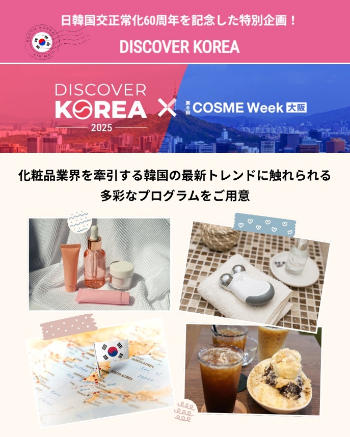2025년 9월 24일(수)부터 3일간, 인텍스 오사카 전시장에서 제6회 COSME Week OSAKA가 개최됐다. 올해로 여섯 번째를 맞은 이번 전시회에는 한국 37개사를 포함해 해외 기업 63개사, 총 207개 기관 및 기업이 참가했으며, 1만6140명의 참관객이 방문했다. 이번 전시회는 화장품 개발에 특화돼 고기능 원료와 패키지 등을 소개하는 제6회 화장품 개발전 오사카와, 유통·소매업 관계자뿐 아니라 살롱·클리닉 관계자에게도 최신 화장품 및 미용용품을 소개하는 제6회 국제 화장품전 오사카로 구성됐다.