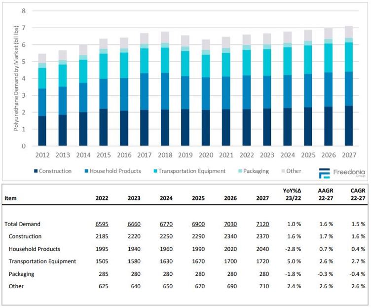 미국 화학협의회(American Chemistry Council, ACC)가 2025년에 발표한 「2024년 미국 폴리우레탄 산업의 경제적 이점」 보고서에 따르면, 미국 폴리우레탄 시장은 2012년부터 2022년까지 매년 평균 1.6%씩 성장했다. 2012년에 약 55억 파운드(약 10조4900억 원)였던 수요는 2018년 68억 파운드(약 12조9800억 원)로 최고치를 기록했다. 2015년에는 건설 지출이 12% 늘면서 6.3%의 높은 성장률을 보였지만, 2020년에는 코로나19의 영향으로 수요가 5.7% 줄었다. 팬데믹 이후 가구와 가전 등 소비재 분야에서 수요가 일시적으로 늘었으나, 2022년 이후 일부 산업이 침체되면서 2024년 생산과 소비는 2022년보다 감소했다. 그럼에도 불구하고 2024년 기준으로 이 산업은 32만 5000개의 일자리를 만들고 1133억 달러의 경제 효과를 내는 등 경제 전반에 여전히 기여하고 있다. 앞으로 2022년부터 2027년까지 미국 폴리우레탄 시장은 66억 파운드(약 12조6000억 원)에서 71억 파운드(약 13조5600억 원)로 커지면서 매년 평균 1.5%씩 성장할 것으로 예상된다. 다만 2023년에는 건축 자재 출하량이 줄어 경질폼 수요가 제한되면서 성장률이 1.0%에 그칠 것으로 보인다.