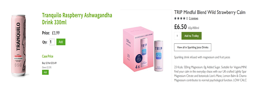 ‘적응 물질(adaptive agent)’ 이라는 뜻에서 유래된 ‘아답토젠(Adaptogen)’은 인체가 신체적, 정신적 스트레스에 적응하도록 돕는 천연 성분을 의미한다. 영국에서는 아슈와간다(Ashwagandha)*, 로디올라 로사(Rhodiola rosea)**, 약용 버섯(Medicinal mushrooms) 등의 천연 성분이 함유된 음료를 '아답토젠 음료'라고 부른다. 영국 내 소매점, 드럭스토어(drug store), 식음료점 등 주요 채널을 통해 보편적으로 유통되고 있다. 음료 유통 관련 온라인 매거진 ‘The On-Trade’에 따르면, 2025년 기준 영국 내 소비자 대상으로 진행한 응답자의 약 15%가 허브·천연물 기반 음료를 정기적으로 섭취하는 것으로 조사됐다.