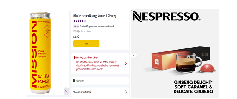 <레몬, 인삼 함유 에너지 음료(좌)/네스프레소 Ginseng Delight(우)>