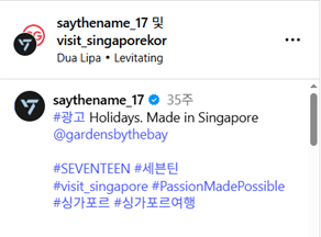 또한 세븐틴은 유료 광고(#광고)로 표시된 인스타그램 게시물을 통해 #VisitSingapore 해시태그를 사용했는데, 이는 STB의 공식 관광 홍보 이니셔티브이다. 게시물에는 멤버들이 마리나 베이 샌즈, 주얼 창이공항, 아트사이언스 뮤지엄 등 싱가포르의 주요 명소를 방문하는 장면이 담겨 있어, 싱가포르를 활기차고 매력적인 관광지로 전 세계 팬들에게 자연스럽게 노출했다.