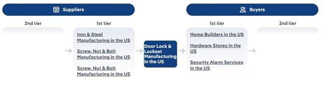 하위 공급망의 주요 바이어는 미국 내 주택 건설업체, 하드웨어 매장, 보안 경보 서비스 등이다. 이들 바이어는 도어락 제품의 가격이나 구매량에 미치는 영향력이 제한적이며, 대체제가 거의 없고 브랜드 신뢰도와 품질이 구매 결정의 주요 요인으로 작용한다.