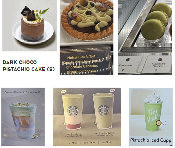 현지 언론사 CNA Luxury는 지난 1년 동안 가장 많이 회자된 '떠오른 새로운 맛의 유행'으로 피스타치오를 소개했다. 그리고 이를 입증하듯 피스타치오의 열기가 디저트 전반을 휩쓸며 대형 리테일 매대와 선물 시장까지 파고들었다. 현지 언론사 The Straits Times는 피스타치오의 메뉴와 음료 전반이 확산되는 흐름을 소개했으며, 특히 디저트와 간식류에서 그 트렌드가 두드러진다고 보도했다. 이를 확인하듯 글로벌 커피 전문점과 디저트 가게에서 피스타치오 라테, 케이크, 타르트 등 피스타치오 음료 및 디저트를 선보이고 있으며, 소비자들의 선택 폭을 넓혀 재미를 주고 있다.