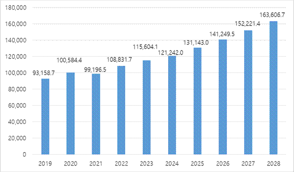 베트남 소매시장은 2019년 931억 5870만 달러에서 2024년 1212억 달러로 성장하며 꾸준한 확대세를 보인다. 이는 5년간 약 281억 달러 증가한 수치로, 향후에도 견조한 성장세가 지속될 전망이다. 시장조사기관 Euromonitor에 따르면, 베트남 소매시장 규모는 2029년 기준 약 1700억 달러에 이를 것으로 예측된다.