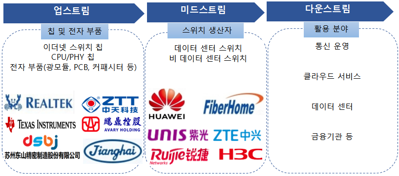 중국 스위치 산업의 업스트림은 칩 및 전자 부품(이더넷 스위치 칩, CPU/PHY 칩, 광모듈, PCB, 커패시터 등)을 취급하는 업체들로 구성되며, 미드스트림은 스위치(데이터 센터 스위치, 비 데이터 센터 스위치 포함) 제조 회사로 이뤄져 있다. △통신 운영, △클라우드 서비스, △데이터 센터, △금융기관 등 스위치를 활용하는 다양한 산업군들이 다운스트림을 구성하고 있다.
