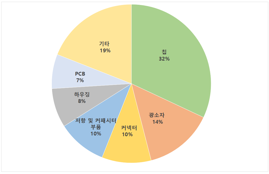 스위치의 비용 비중을 보면, 제품은 주로 칩, 광소자, 커넥터, 저항 및 커패시터 부품, 하우징, PCB 등으로 구성된다. 이 중 칩의 원가 비중이 32%로 가장 높으며, 광소자 14%, 커넥터 10%, 저항 및 커패시터 10%, 하우징 8%, PCB 7% 순으로 나타난다. 이는 고성능 네트워크 처리를 위해 핵심 부품인 칩의 기술 경쟁력이 시장 경쟁력을 좌우함을 보여준다.