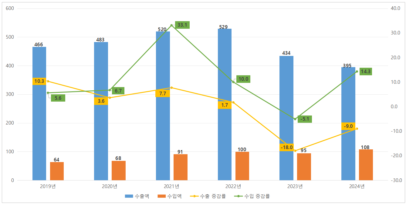 <2019~2024년 중국 스위치 수출입액 및 증감률 추이>