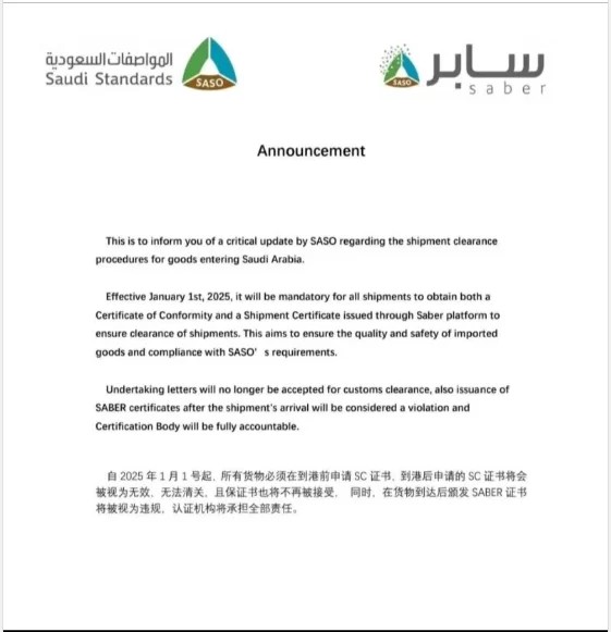 2025년 10월 1일부터는 수입업자가 통관 신고 전 SABER 플랫폼(사우디 표준청인 SASO의 플랫폼)에 선적적합성 인증서(SCoC) 발급 의무화를 어길 시 사우디 정부의 제재가 가능해졌다. 해당 인증서 없이는 통관이 불가능하며, 미취득시 통관 지연 및 추가 행정처분이 가능하다. 이에 모든 수입업자들은 해당 절차를 반드시 준수하여야 한다.
